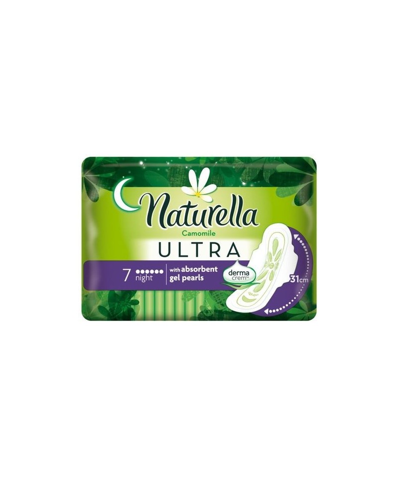 Naudodamos NATURELLA ULTRA NIGHT paketus, menstruacijų metu mėgaukitės idealiu apsaugos ir odos priežiūros deriniu! Jums neabejotinai patiks gaivus, gamtos įkvėptas ramunėlių aromatas. NATURELLA siūlo paketus, pasižyminčius raminamosiomis „Dermacrem™“ savybėmis, kurios padeda išvengti odos sudirgimo. „Dermacrem™“ yra užteptas juostelėmis ant kiekvieno higieninio paketo viršutinio sluoksnio ir naudojant patenka ant odos. Išimtas iš popierėlio paketas su „Dermacrem™“ atrodo sausas liečiant, tačiau jį įdėjus į kelnaites ir jam sąveikaujant su šiltu kūnu, kreminis balzamas po truputį suminkštėja ir patenka ant odos. Taip „Dermacrem™“ padeda išvengti odos sudirginimų, kuriuos gali sukelti pernelyg didelė drėgmė ir trintis. NATURELLA paketai ne tik rūpinasi jūsų oda, bet ir užtikrina menstruacijų metu reikalingą apsaugą. Paketai turi išskirtinę sugerties sistemą, pasižyminčią gėlės formos dizainu, ir pluoštą su itin daug absorbento, kuris paskirsto ir sugeria skystį į paketą, ir jį saugo, kad oda būtų sausa ir jaustųsi patogiai.