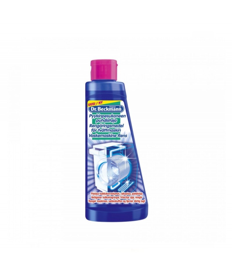 Skalbimo mašinų priežiūros priemonė Dr. Beckmann 250 ml -Tai specialus valiklis, skirtas skalbimo mašinoms valyti ir prižiūrėti. Valiklis pašalina kvapus, kalkes ir apnašas nuo būgno, vamzdžių ir kaitinimo elementų bei kitų sunkiai pasiekiamų vietų. Tensidai suardo kietus nešvarumus. Organiniai kalkių tirpikliai pašalina kalkių apnašas. Priežiūrai skirtos sudedamosios dalys padeda ilgiau išlaikyti guminių detalių elastingumą. Apsaugai nuo korozijos skirtos sudedamosios dalys apsaugo metalines dalis. Skalbimo mašina vėl skalbia higieniškai, švariai ir taupo elektros energiją. 250 ml užtenka vienai kompleksinės priežiūros ir valymo procedūrai. Priemonę patartina naudoti 2-3 kartus per metus.